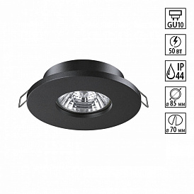 Встраиваемый неповоротный светильник с повышенной степенью пылевлагозащиты (IP44) подходит для установки во влажные помещения. Лампа в комплект не входит.