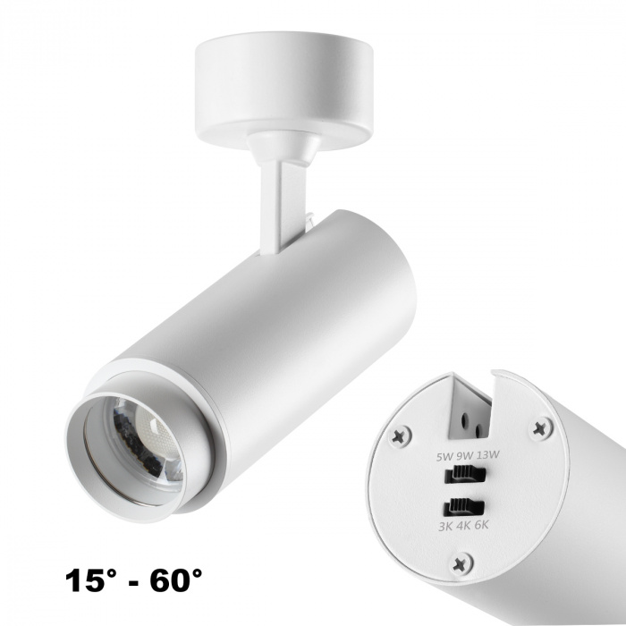 Накладной светодиодный светильник NAIL с переключателем цветовой температуры (3000К-4000К-6000К) и переключателем мощности (5Вт-9Вт-13Вт). А так же с изменяемым углом рассеивания (от 15° до 60°).