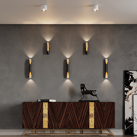 Корпус потолочного накладного светильника выполнен в белом матовом цвете, внутренняя часть — в трендовом цвете золотистого фольгирования. В светильнике используются сменные лампы с цоколем GU10: замену лампы можно осуществить за счет съемного верхнего корпуса.