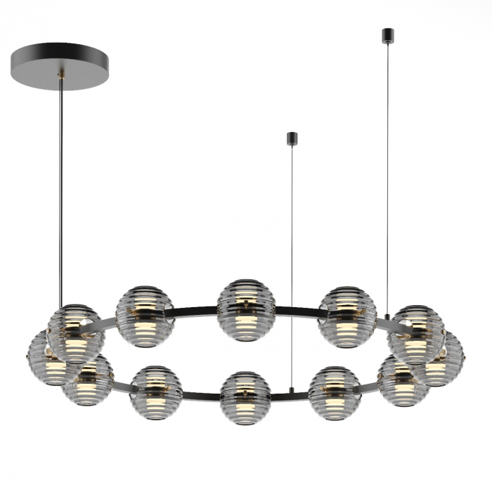 Линия Troni — роскошные кольца со стеклянными плафонами из двух полусфер. LED-элемент красиво рассеивает свет сквозь рифленую текстуру дымчатого стекла вверх и вниз. Из колец диаметром 630, 930 и 1130 мм можно создавать композиции на два и три кольца. Модель овальной формы отлично подойдет для размещения над обеденной или рабочей зоной. Одиночный подвес и бра дополняют линейку светильников линии Troni.