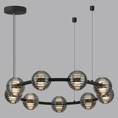 Линия Troni — роскошные кольца со стеклянными плафонами из двух полусфер. LED-элемент красиво рассеивает свет сквозь рифленую текстуру дымчатого стекла вверх и вниз. Из колец диаметром 630, 930 и 1130 мм можно создавать композиции на два и три кольца. Модель овальной формы отлично подойдет для размещения над обеденной или рабочей зоной. Одиночный подвес и бра дополняют линейку светильников линии Troni.