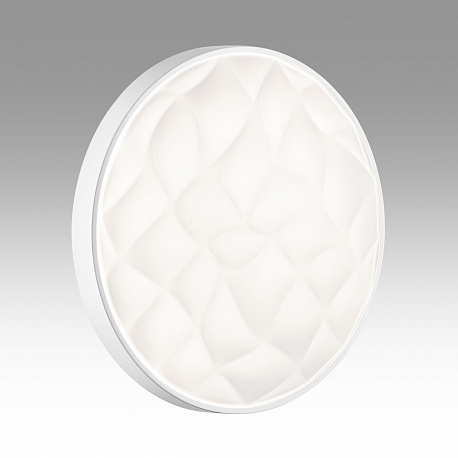 Светильник 7672/DL линии GITUM состоит из металлического основания (базы) и пластикового рассеивателя. Материал рассеивателя — высококачественный пластик марки PMMA 2.0 белого цвета с матовой поверхностью. Пластик обеспечивает светильнику равномерное рассеивание и хорошее светопропускание. Форма плафона: круглая, декорирована рельефной структурой и ободом из пластика белого цвета. Степень защиты IP43 позволяет использовать светильник в определенных зонах влажных помещений. В комплект входит заменяемый LED-модуль с линзами мощностью 48 Вт, соответствующей лампе накаливания 460 Вт. Источник света имеет комфортную цветовую температуру 4000 К (белый свет).