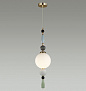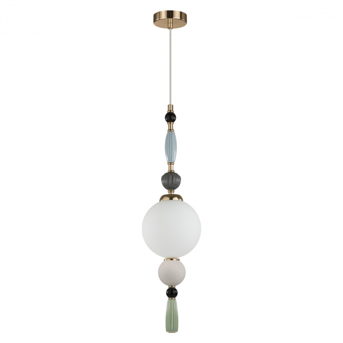 Воздушная линия светильников Palle декорирована керамикой ручной работы. В ней красиво сочетаются гофрированная керамика, металл, покрытый золотой гальваникой, и матовое белое стекло. Керамический декор выполнен в серых оттенках с акцентной светло-зеленой кисточкой и дополнен стеклянными черными бусинами. Подвесы и люстры имеют возможность регулировки высоты благодаря наборной штанге.