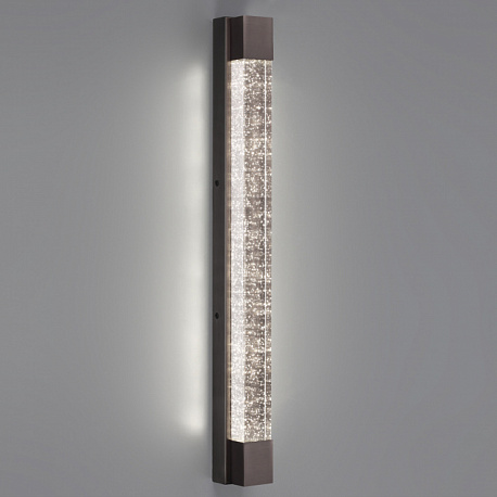 В линии Mirada используются в качестве рассеивателя прямоугольные слитки хрусталя с эффектом пузырьков, основание выполнено в двух цветах: латунь и черный брашированный. Свет светодиодов дает роскошное рассеивание в хрустале и обеспечивает игру света в пузырьках. Светильник представлен в цвете античная бронза и темная брашированная латунь.