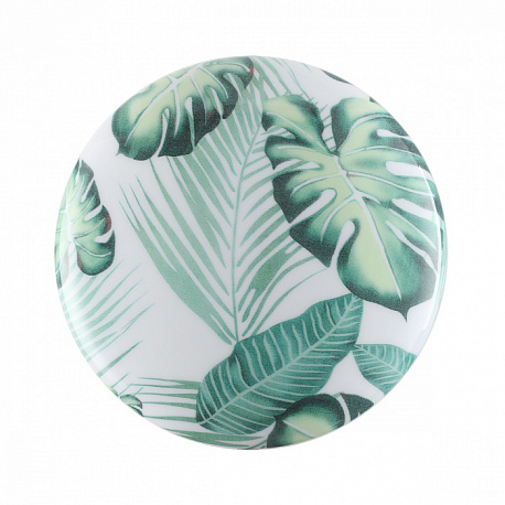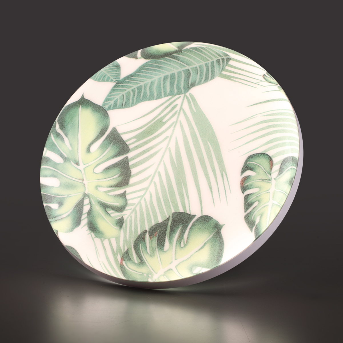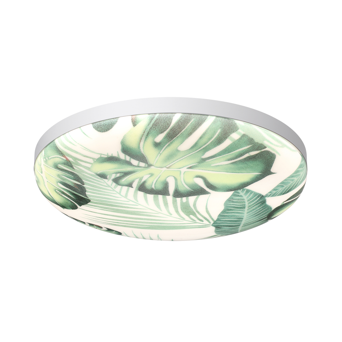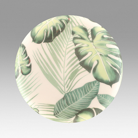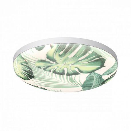 Светильник 7748/EL линии FLORI состоит из металлического основания (базы) и пластикового рассеивателя. Материал рассеивателя — высококачественный пластик марки PMMA 2.0 белого цвета с глянцевой поверхностью, обеспечивающий светильнику равномерное рассеивание и хорошее светопропускание. Форма плафона: круглая, декорирована орнаментом с зеленым рисунком тропических листьев и съемным ободом белого цвета. Рисунок на плафоне выполнен методом цифровой печати по технологии прямого нанесения красок на акриловый лист. Для предотвращения выцветания красок поверх рисунка нанесен слой белой краски. После выдувания плафона при высоких температурах красочный рисунок приобретает стойкость и долговечность. Степень защиты IP43 позволяет использовать светильник в определенных зонах влажных помещений. В комплект входит заменяемый LED-модуль с линзами мощностью 70 Вт, соответствующей лампе накаливания 610 Вт, а также пульт ДУ, с помощью которого осуществляется плавное изменение цветовой температуры в диапазоне 3000—6000 К.