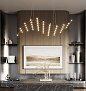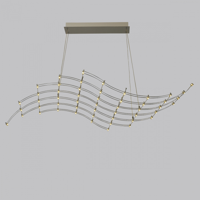 Парящий подвес WELKIN имеет конструкцию из изящных прутьев из нержавеющей стали марки SS304 в цвете хром и золото. Множество равномерно встроенных LED-модулей (100×0,45 Вт) создают мерцающее изогнутое полотно длиной 1300 мм.