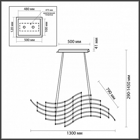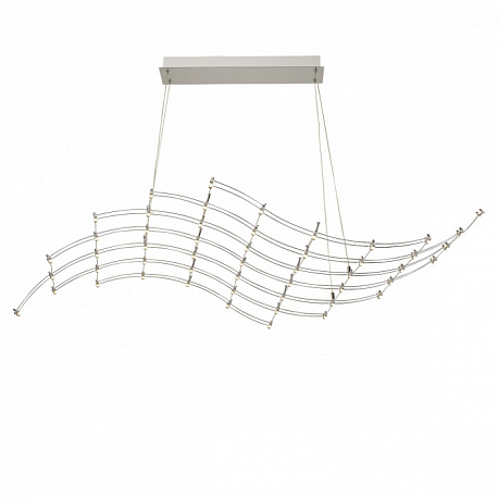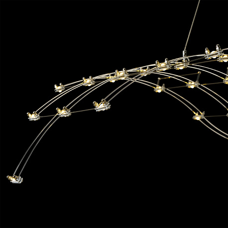 Парящий подвес WELKIN имеет конструкцию из изящных прутьев из нержавеющей стали марки SS304 в цвете хром и золото. Множество равномерно встроенных LED-модулей (100×0,45 Вт) создают мерцающее изогнутое полотно длиной 1300 мм.
