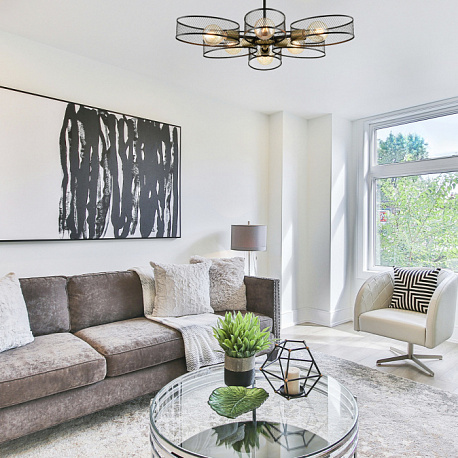 Светильник VIVANA выполнен в виде девятиконечной звезды, в которой сетчатые металлические плафоны соединяются с центральным элементом каркаса. Плафоны имеют вытянутую округлую форму и изящно обволакивают каждую из ламп светильника. Модель достаточно объемна, но за счет структуры плафонов она выглядит легко. VIVANA станет отличным выбором для освещения обеденных зон, использования в студиях, кафе и ресторанах.