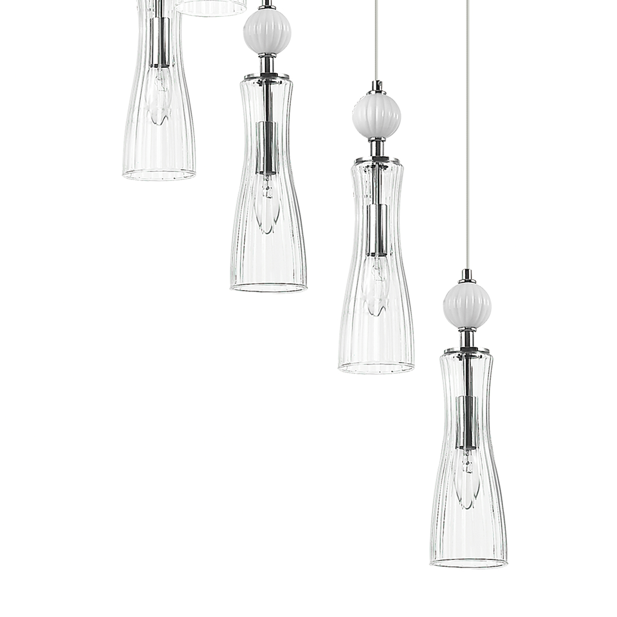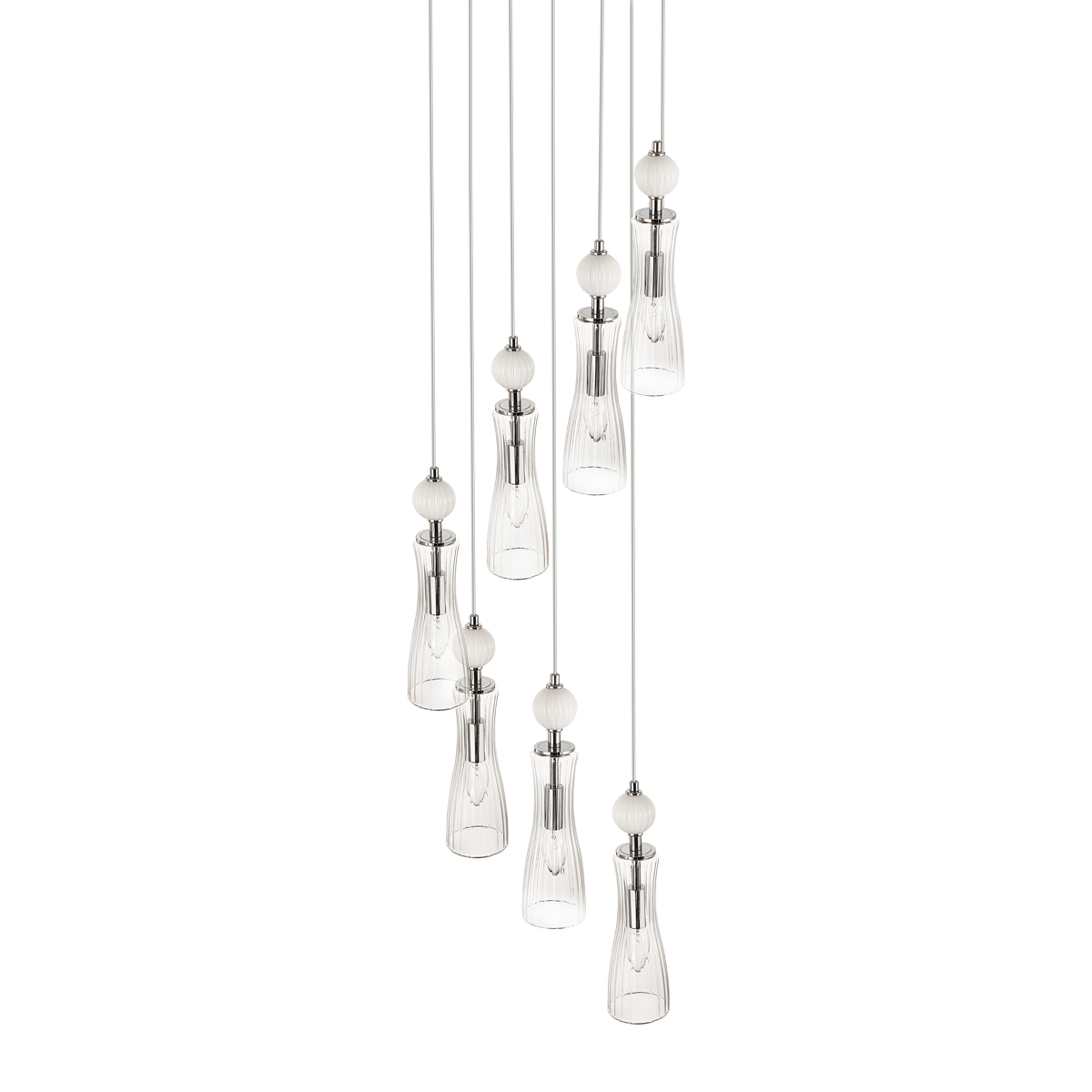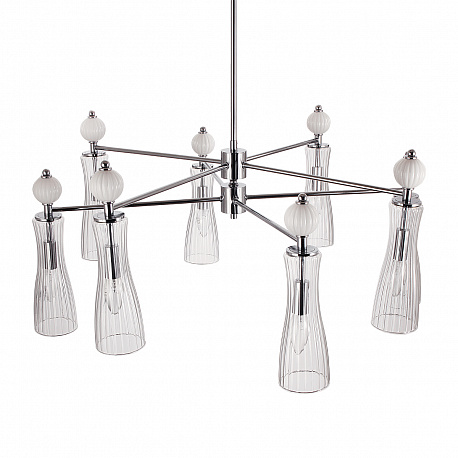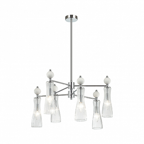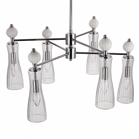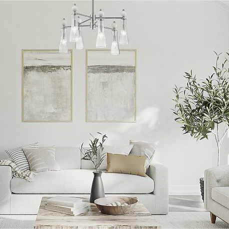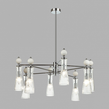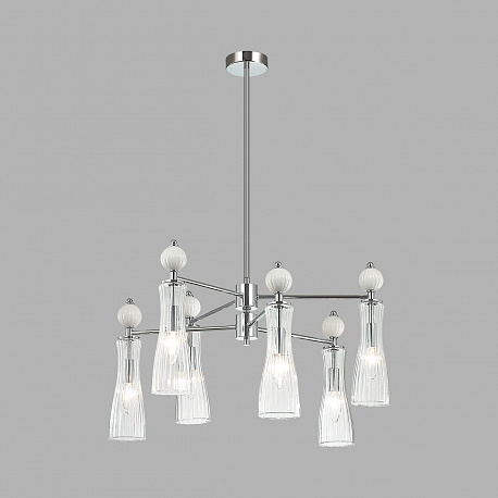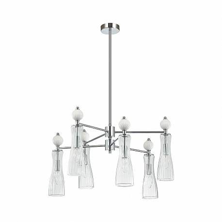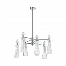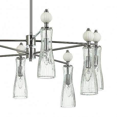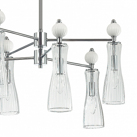 Легкая и изящная серия EMILY декорирована белыми керамическими элементами. Линии — тренд в современном дизайне, они повторяются на стеклянных плафонах и шариках. Хромированные элементы арматуры тонкие и практически растворяются в интерьере. Серия содержит люстры на 6 и 8 рожков, бра с выключателем, подвес на 1 лампу с возможностью регулировки по высоте.