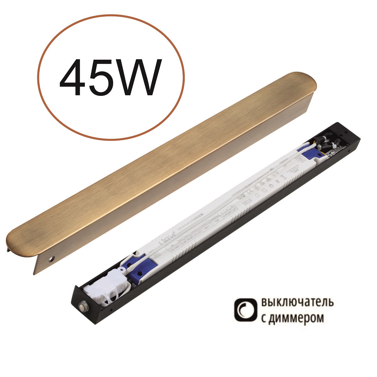 Диммируемый драйвер LEDA мощностью 45 Вт используется для линии FINO XS. Рекомендуется использование с элементами отраженного света FINO XS, суммарная мощность которых не должна превышать 38 Вт. Диммер-выключатель с функцией памяти находится на корпусе. Цвет корпуса ― брашированная бронза. В отличие от драйверов 357784―357788 имеет скругленный элемент на корпусе.