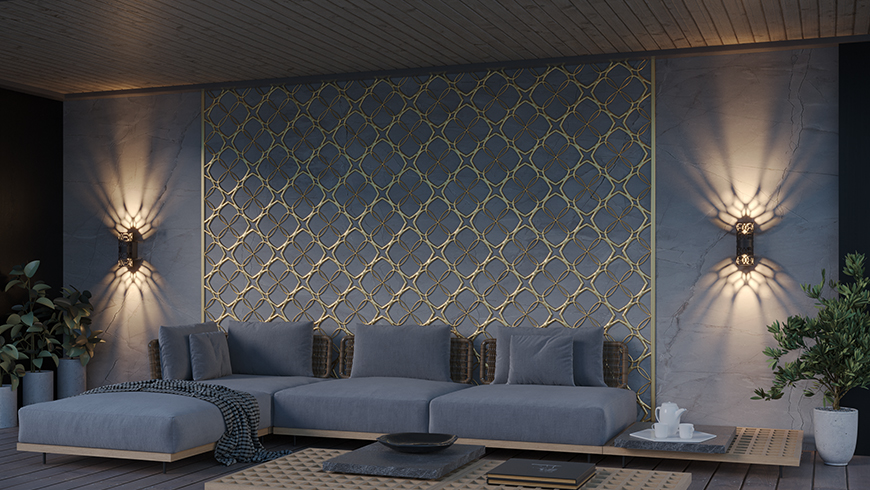 Центральным элементом стала подвесная люстра Toscana арт. 5447/40L от Odeon Light Exclusive. Ее каркас цвета античной бронзы и рассеиватели, напоминающие половинки зерен, из искусственного материала с паттерном под алебастр, усиливают эффект от геометричного гипсового панно и подчеркивают мраморный орнамент панели из керамогранита. Люстра Toscana словно свет тосканских полей задает тон всему интерьеру.